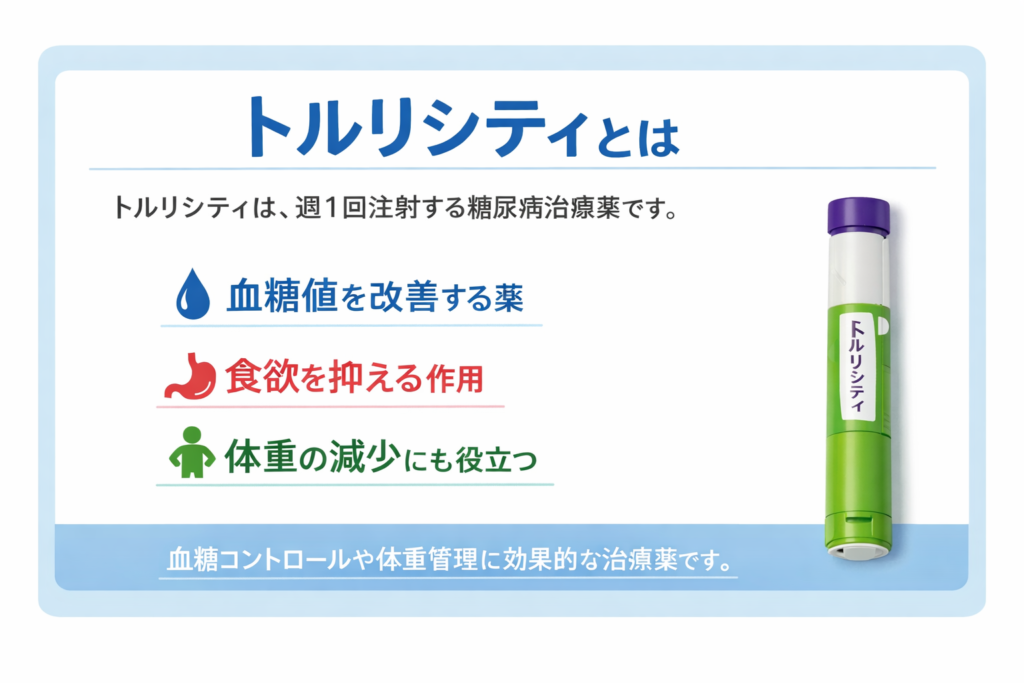 トルリシティ(一般名:デュラグルチド)は、2型糖尿病の治療に使う週1回のGLP-1受容体作動薬(皮下注射)です。