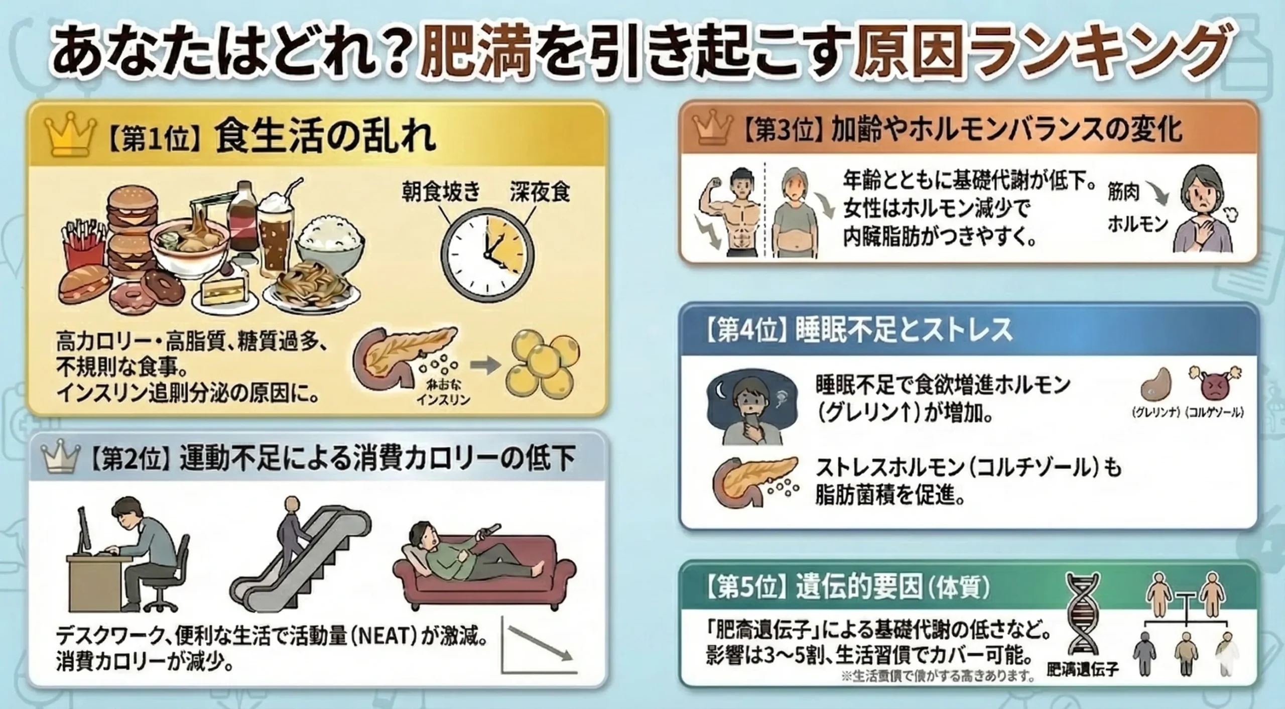 多くの研究や論文で指摘されている、肥満の主な原因をランキング形式でご紹介します。