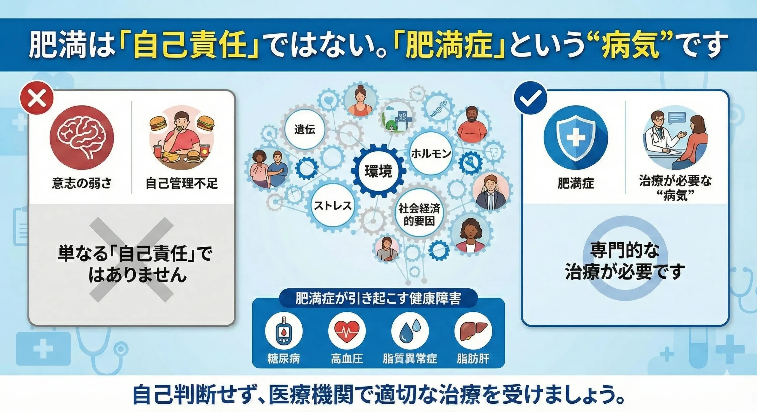 ここまで見てきたように、肥満の原因は非常に複雑で、単なる「意志の弱さ」や「自己管理不足」で片付けられるものではありません。